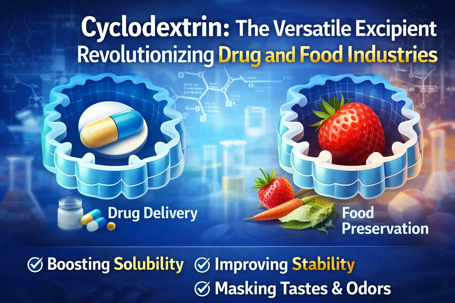साइक्लोडेक्स्ट्रिनको खोज खाद्य र औषधिको इतिहासमा अगाडि बढेको सबैभन्दा महत्त्वपूर्ण कदम हो। यो प्राकृतिक रूपमा हुने चक्रीय ओलिगोसेकराइडले हामीले औषधिहरू वितरण गर्ने, खाना ताजा राख्ने र उद्योगमा धेरै अन्य रसायनहरू प्रयोग गर्ने तरिका परिवर्तन गरेको छ। प्रुडक्टले समावेशी कम्प्लेक्सहरू बनाउँछ जसले धेरै क्षेत्रहरूमा महत्त्वपूर्ण समस्याहरूलाई सम्बोधन गर्दछ यसको विशिष्ट आणविक संरचनाको लागि धन्यवाद, जसमा हाइड्रोफोबिक भित्री गुफा र हाइड्रोफिलिक बाहिरी सतह छ। यो लचिलो excipient ले संसारभरि सूत्रीकरण विज्ञान र निर्माण प्रक्रियाहरू परिवर्तन गर्दैछ। यसले औषधिको अवशोषण सुधार गर्नदेखि औषधिहरूमा खराब स्वाद लुकाउने सबै काम गर्न सक्छ।